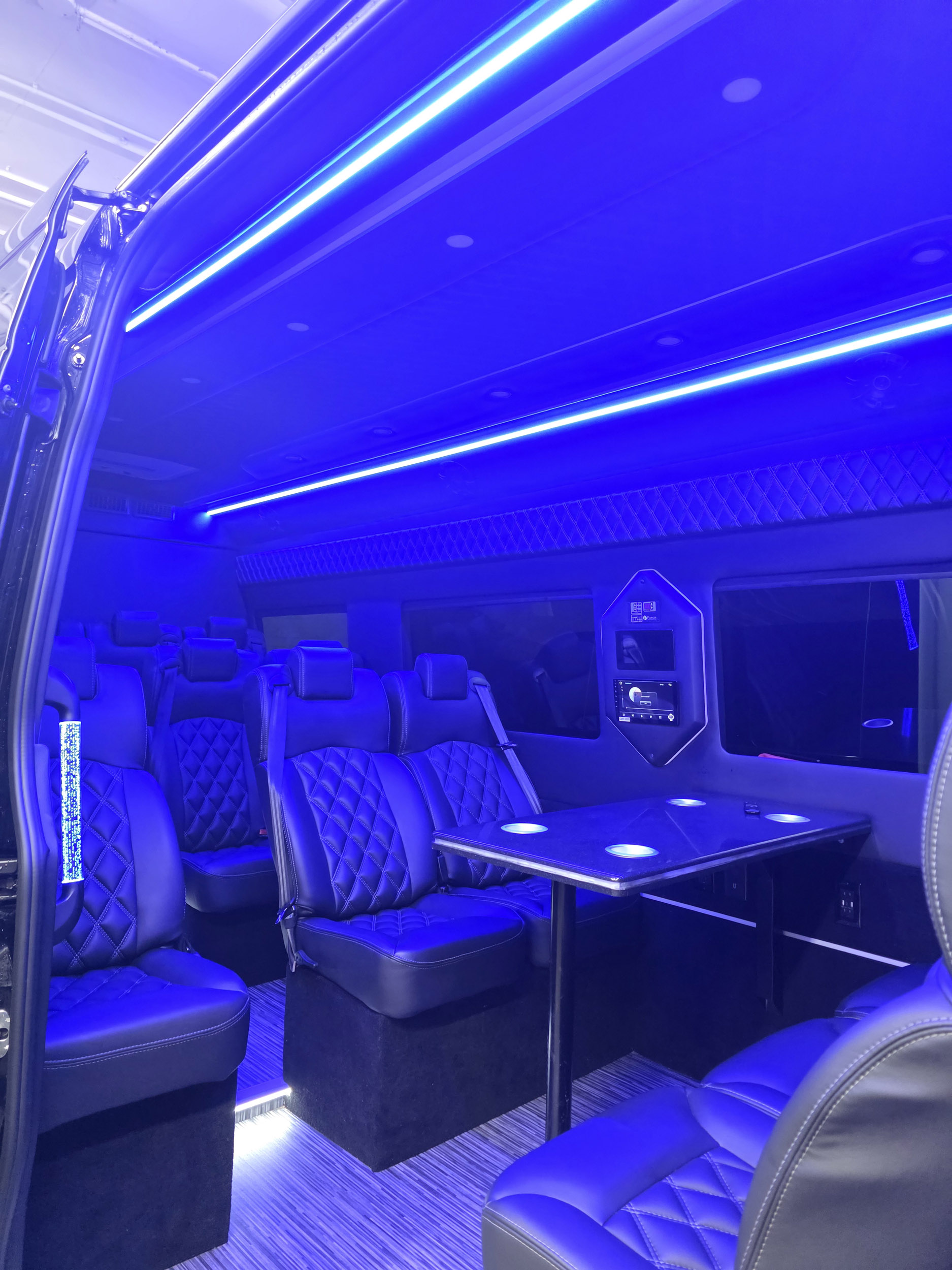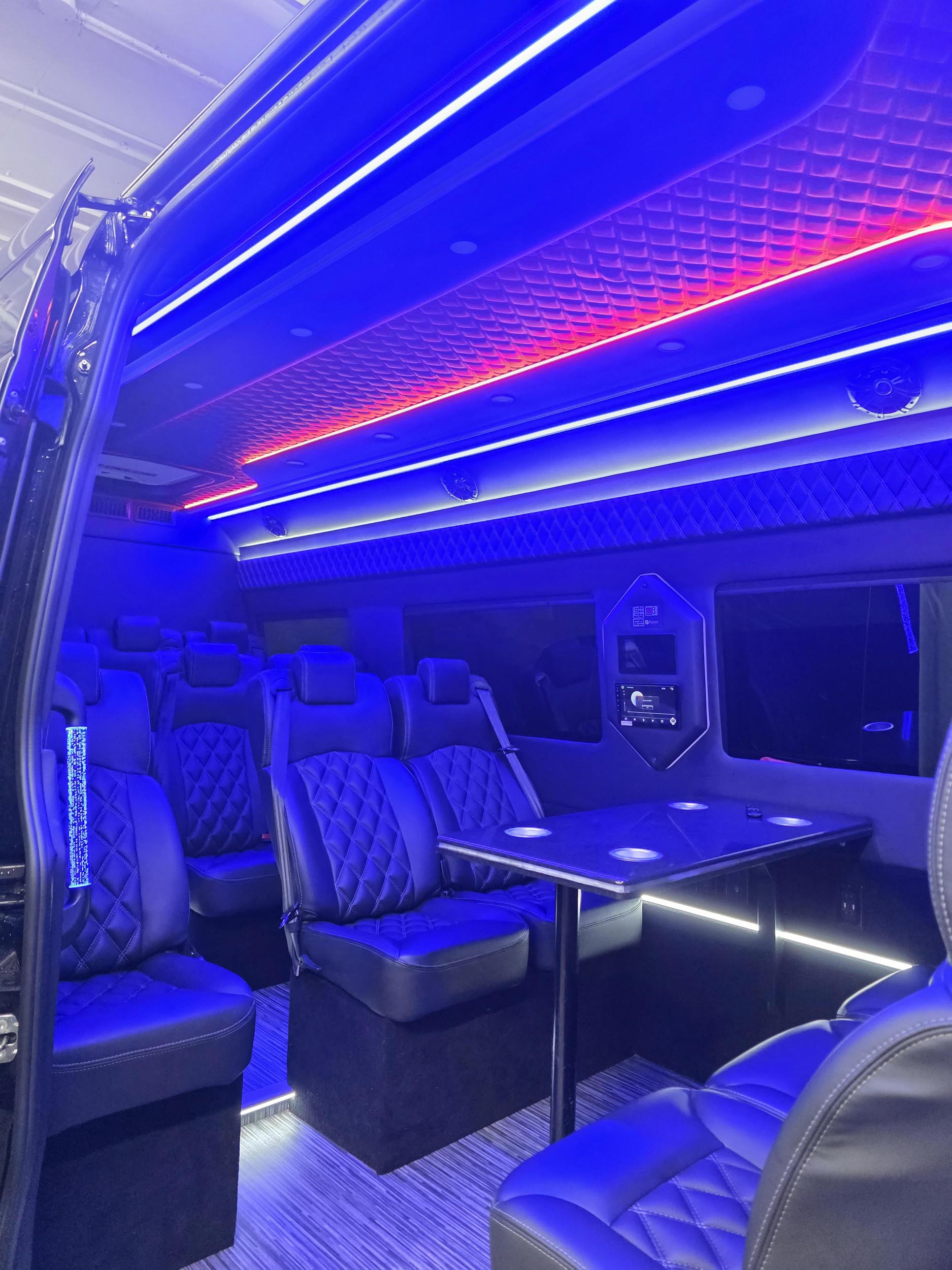 Executive Style Mercedes Sprinter Van is perfect for a Group who is traveling around NYC and loves comfort and style. Sprinter Van provides plenty of room for everyone with luggage. Comfortable Leather Seats, Air Conditioned / Heated depends on a season. This Custom made Sprinter is available in New York City for bookings and best suited for Airport Transfers, Hourly Travel, Point to Point Drop offs or Long Distance Travel. PA system installed with Microphone for a better Sightseeing Tour Experience. Sprinter comes with few aftermarket ammenities like a TV and power outlets. Some Sprinters also come with a laptop table. Mood Lights installed in some Sprinters.